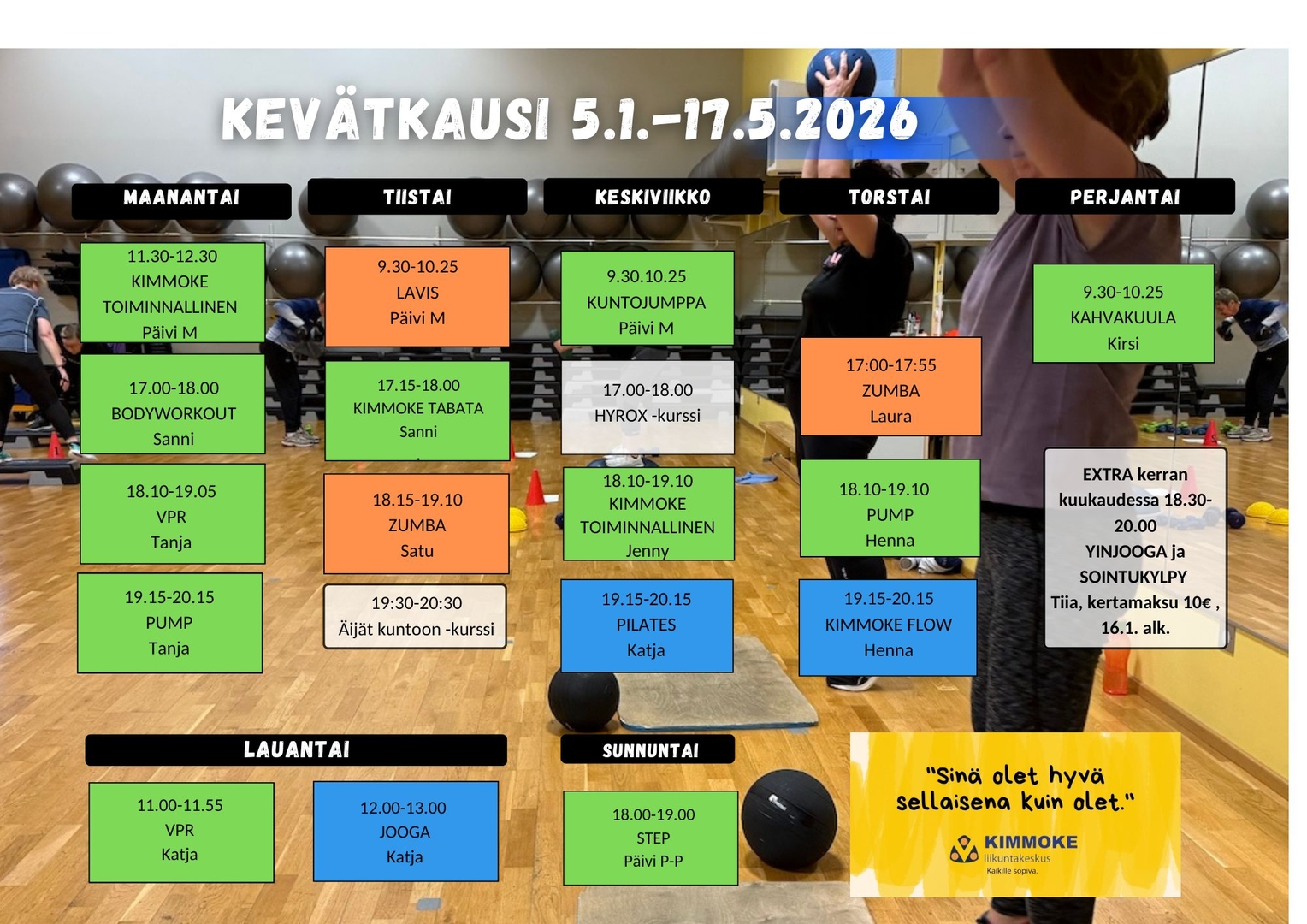 Ohjaajavaihdoista(mm sairaus- tai lomatapauksissa) saatetaan ilmoittaa Facebookin ja Instagramin tarinoissa. Jumppatunneille voi osallistua ilman ennakkoilmoittautumista.